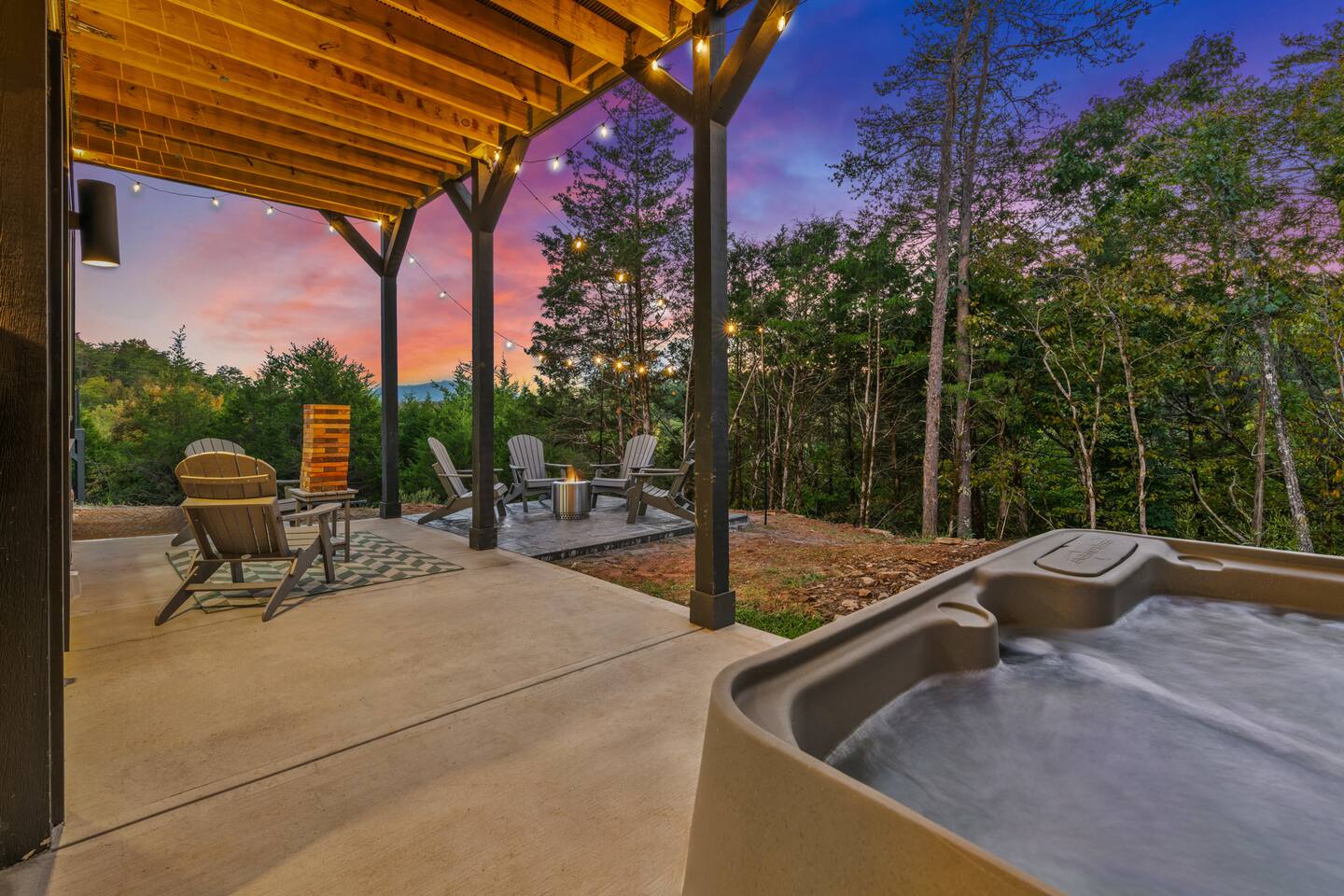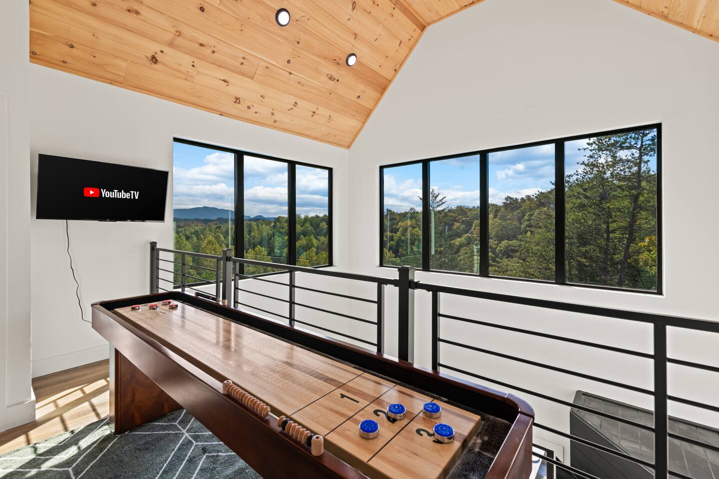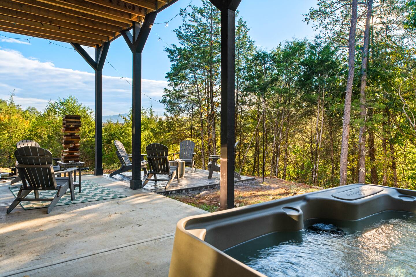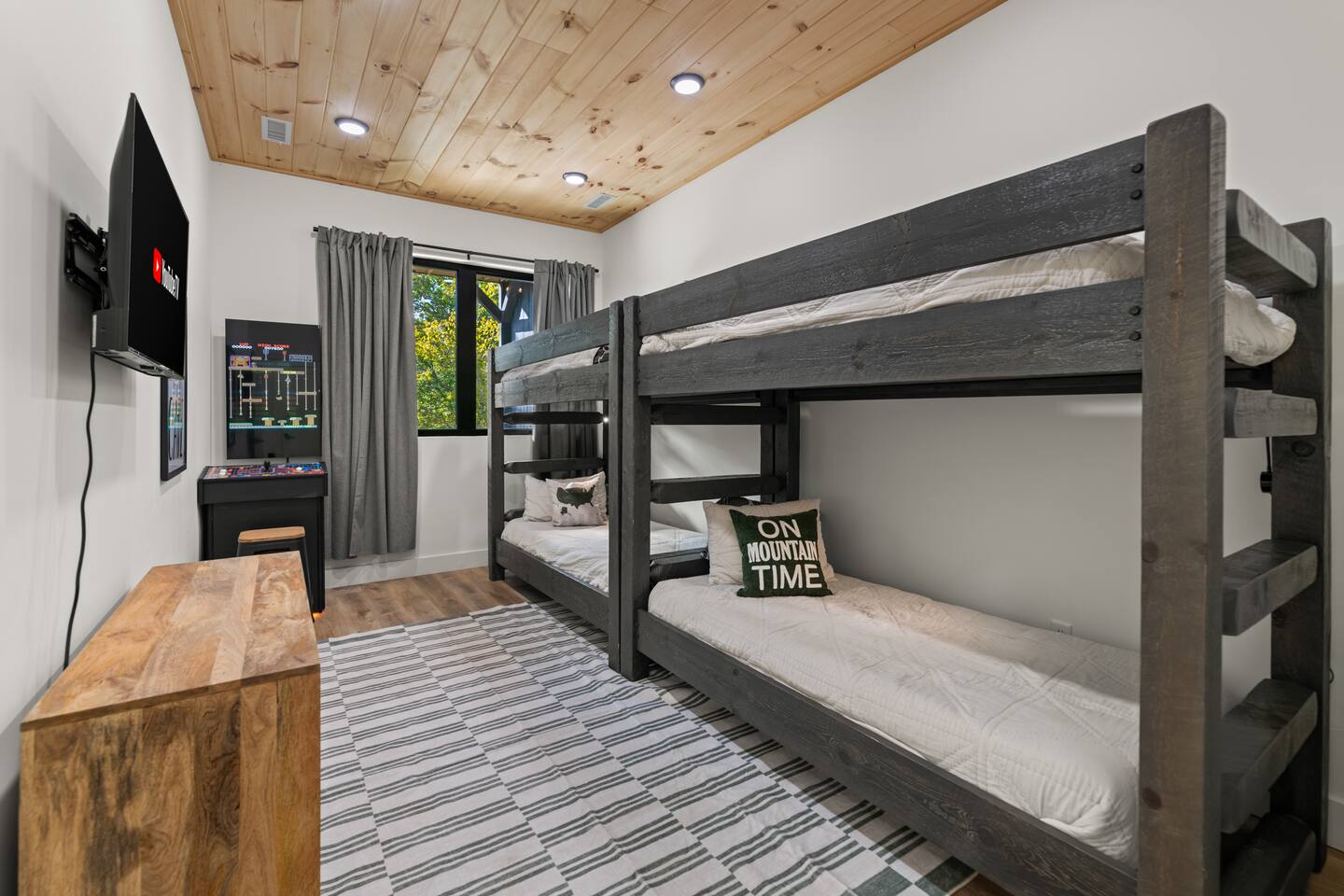 This modern cabin is fun for the whole family! Interested in a swim? A splash in the pool is always fun, but if you want to level it up for your kids- wait until they can have a movie night in the pool! Or maybe you want to relax outdoors? Kick back at the fire pitand tell campfire stories while roasting marshmallows, or take a soak in the hot tub as you enjoy the evening. Or maybe you just want to stay in?For a cozy time inside there is shuffleboard, loads of board games, and an arcade game!