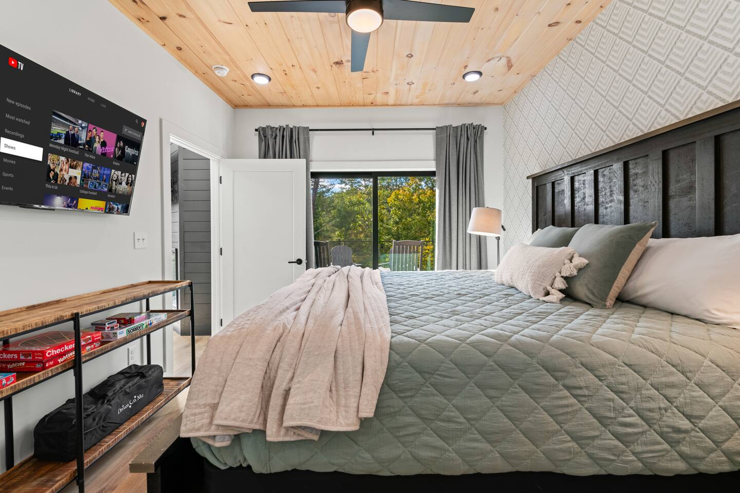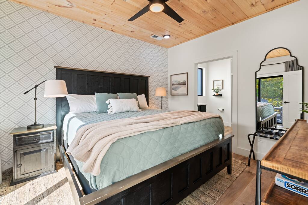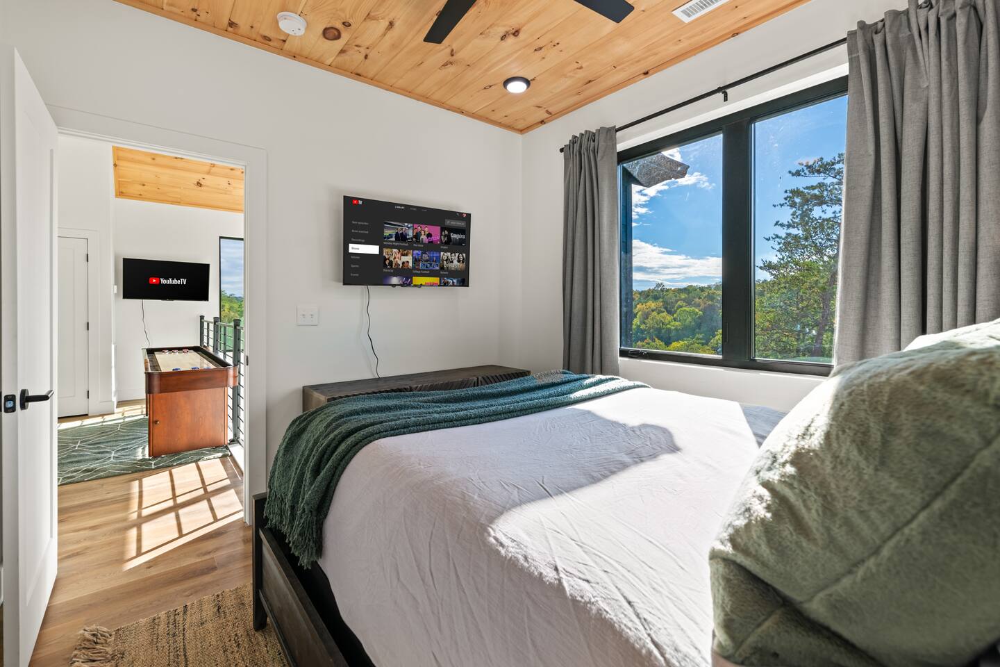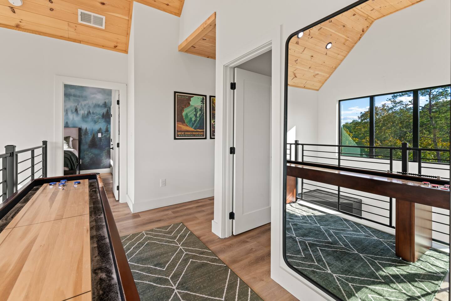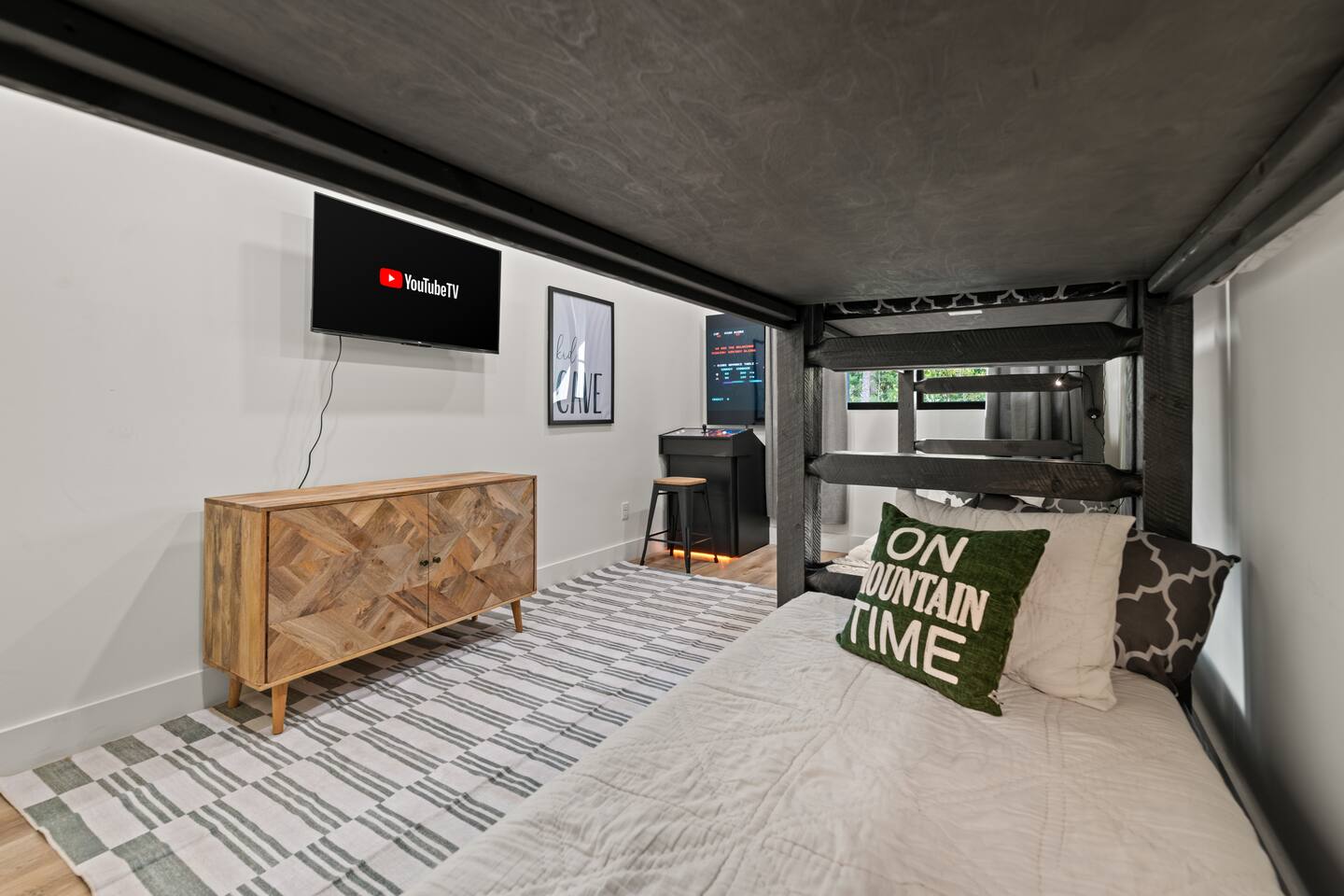 This modern cabin is fun for the whole family! Interested in a swim? A splash in the pool is always fun, but if you want to level it up for your kids- wait until they can have a movie night in the pool! Or maybe you want to relax outdoors? Kick back at the fire pitand tell campfire stories while roasting marshmallows, or take a soak in the hot tub as you enjoy the evening. Or maybe you just want to stay in?For a cozy time inside there is shuffleboard, loads of board games, and an arcade game!