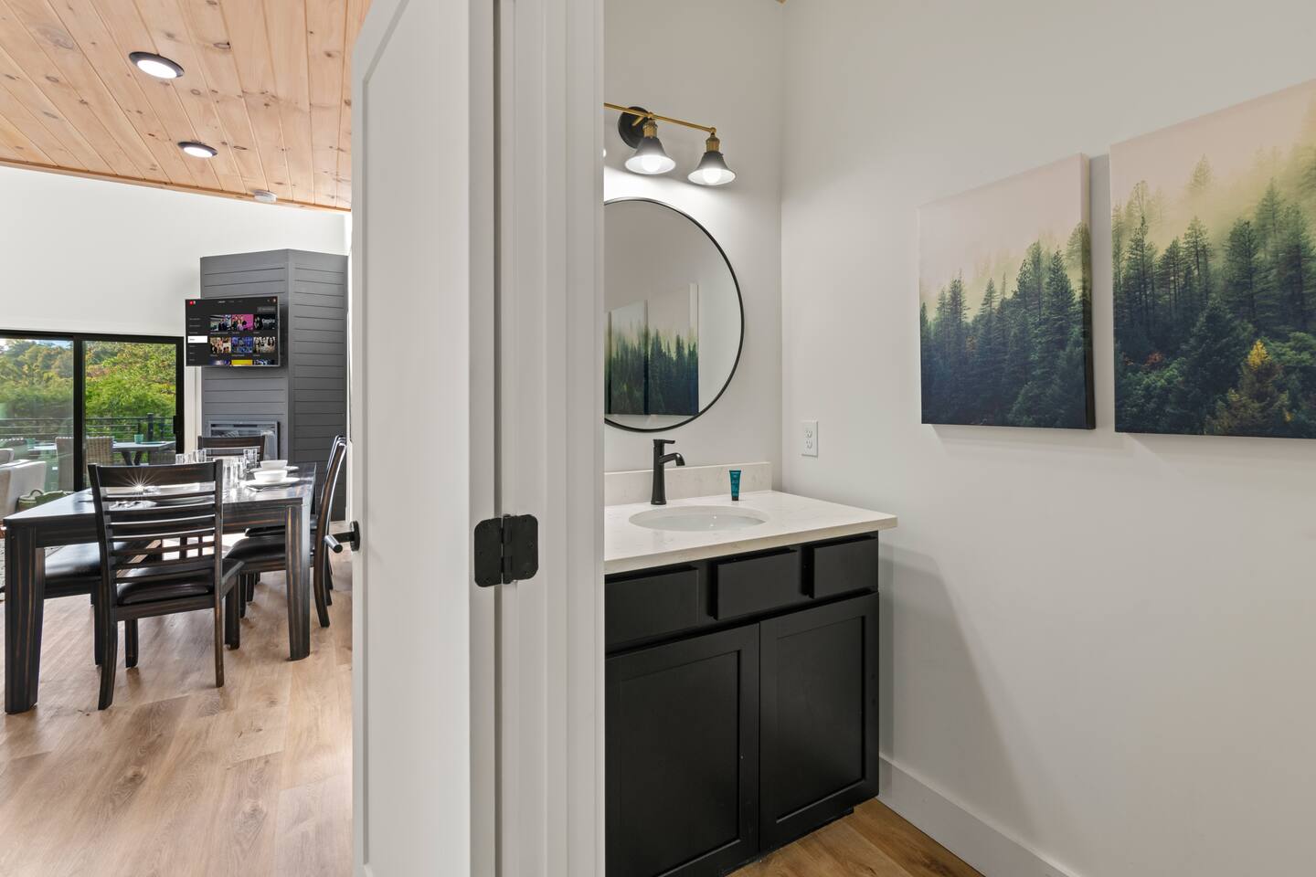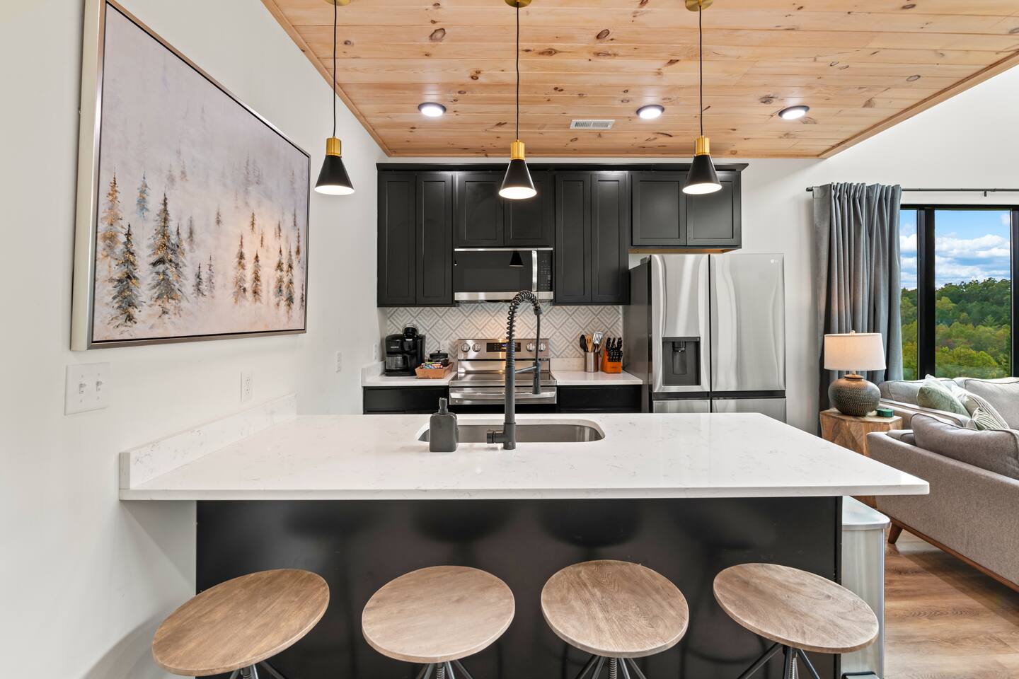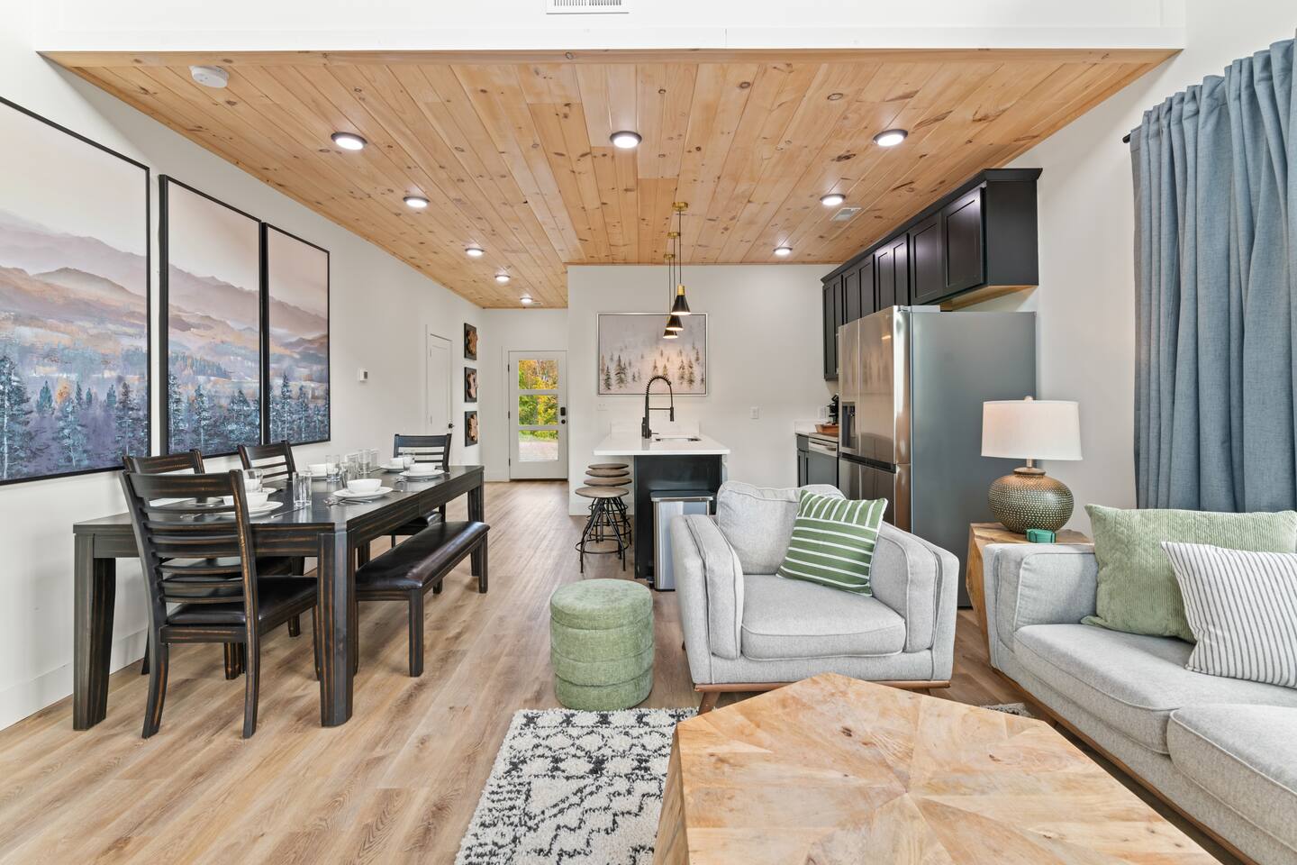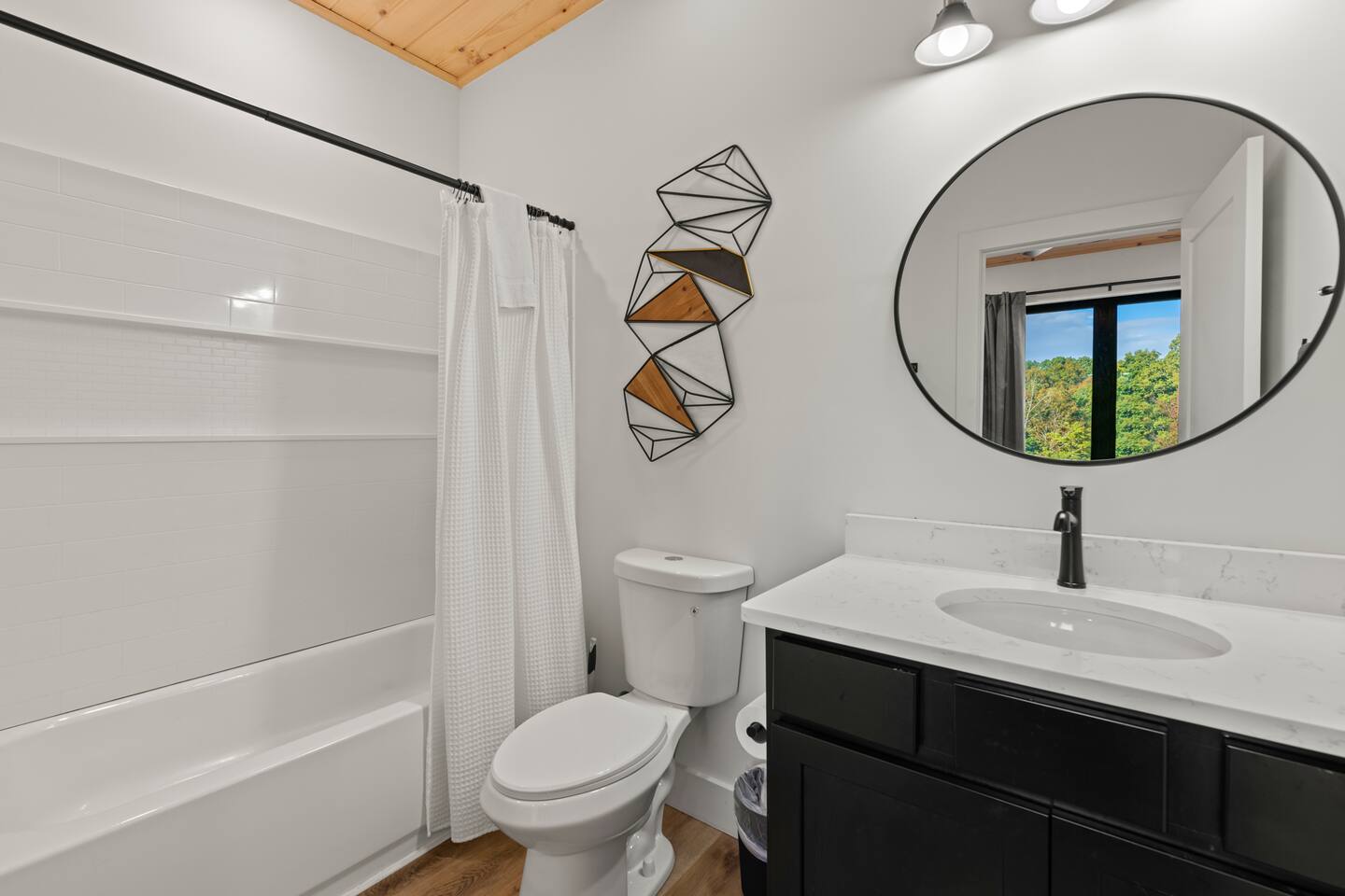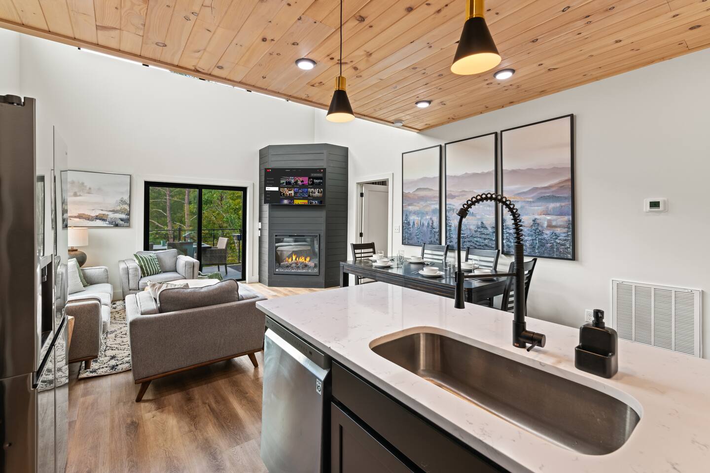 This modern cabin is fun for the whole family! Interested in a swim? A splash in the pool is always fun, but if you want to level it up for your kids- wait until they can have a movie night in the pool! Or maybe you want to relax outdoors? Kick back at the fire pitand tell campfire stories while roasting marshmallows, or take a soak in the hot tub as you enjoy the evening. Or maybe you just want to stay in?For a cozy time inside there is shuffleboard, loads of board games, and an arcade game!